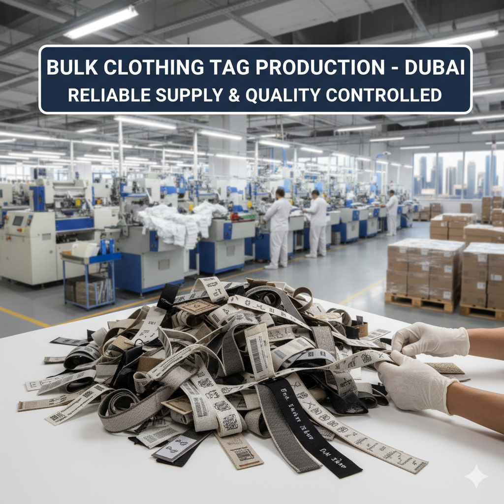 Bulk clothing tag production in Dubai ideal for large-scale garment manufacturing. Reliable supply with quality control at every stage.