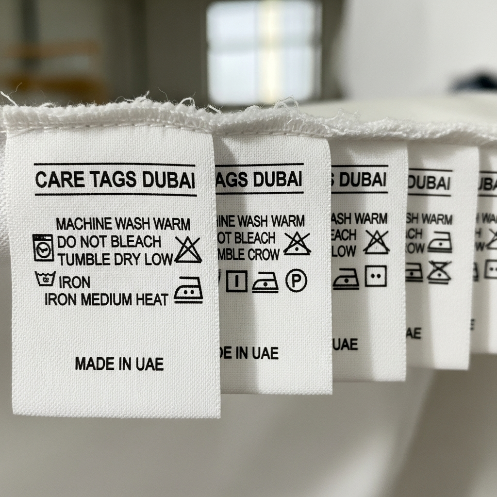 Clear and informative care tags in Dubai providing washing and handling instructions. Designed to improve garment usability and customer satisfaction.