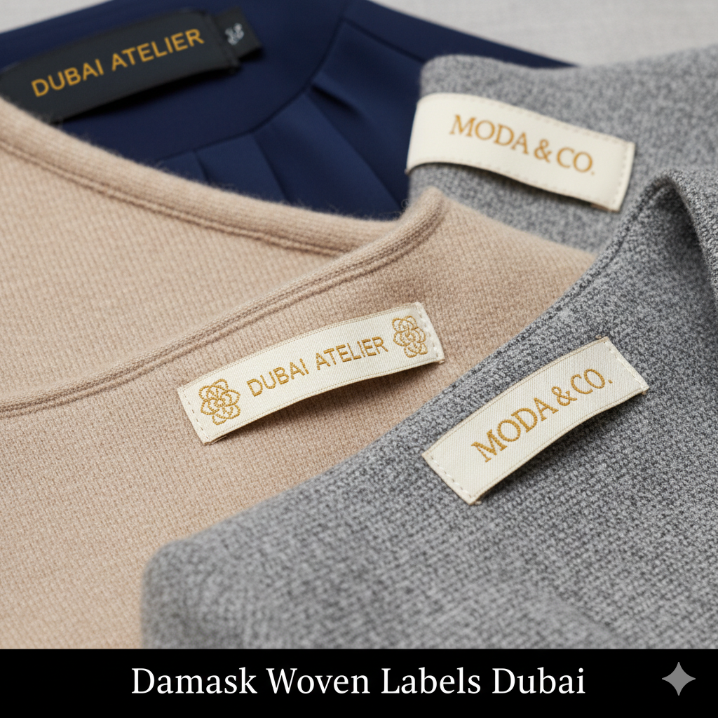 High-definition damask woven labels in Dubai for premium garments. Smooth texture and fine detailing make them ideal for luxury clothing brands.