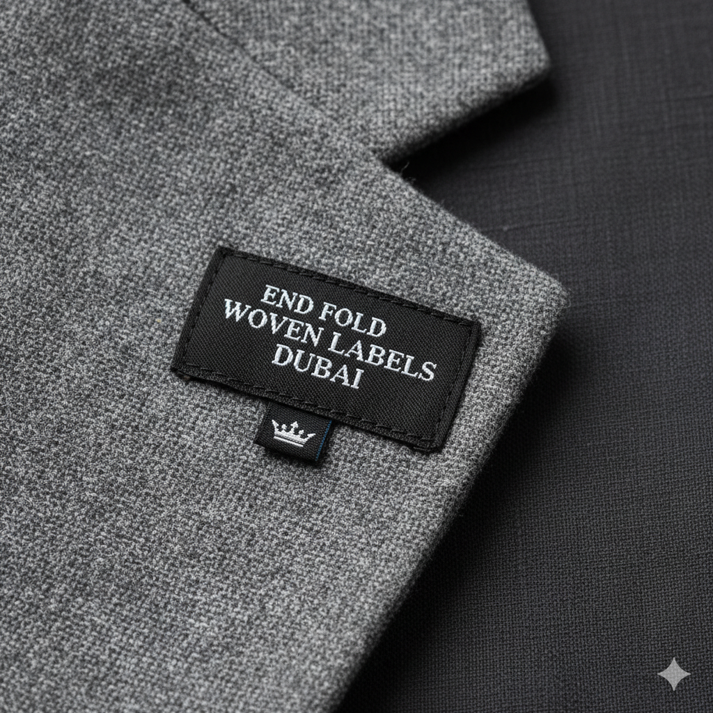 End fold woven labels in Dubai for a neat, professional finish. Designed for secure attachment and enhanced garment presentation.