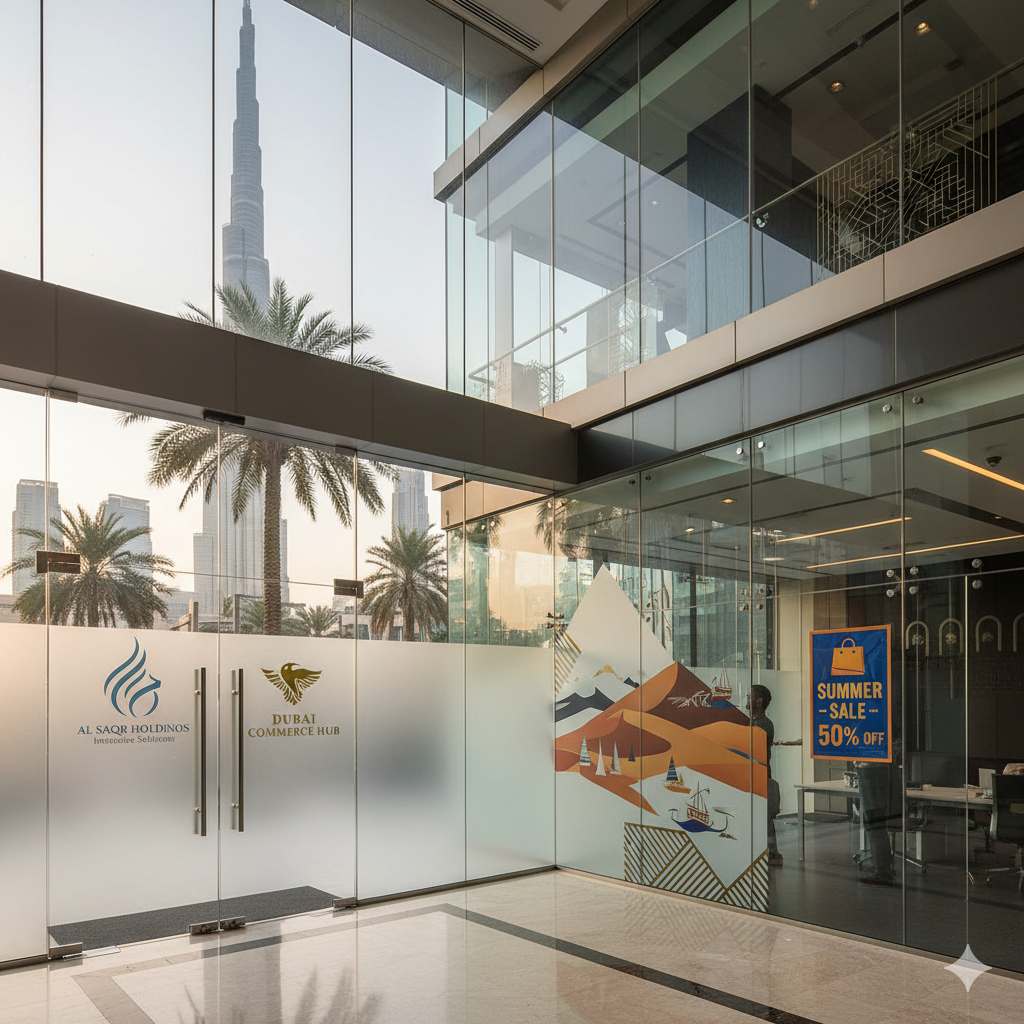 Custom glass sticker printing in Dubai for offices, shops, and commercial spaces. Ideal for branding, privacy, and decorative purposes.