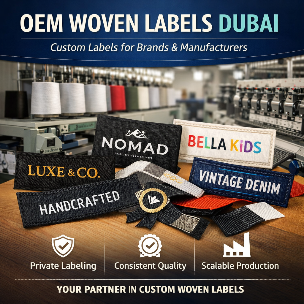 OEM woven labels in Dubai designed for brands and manufacturers looking for customized, factory-level production. We support private labeling, consistent quality, and scalable manufacturing based on your business needs.
