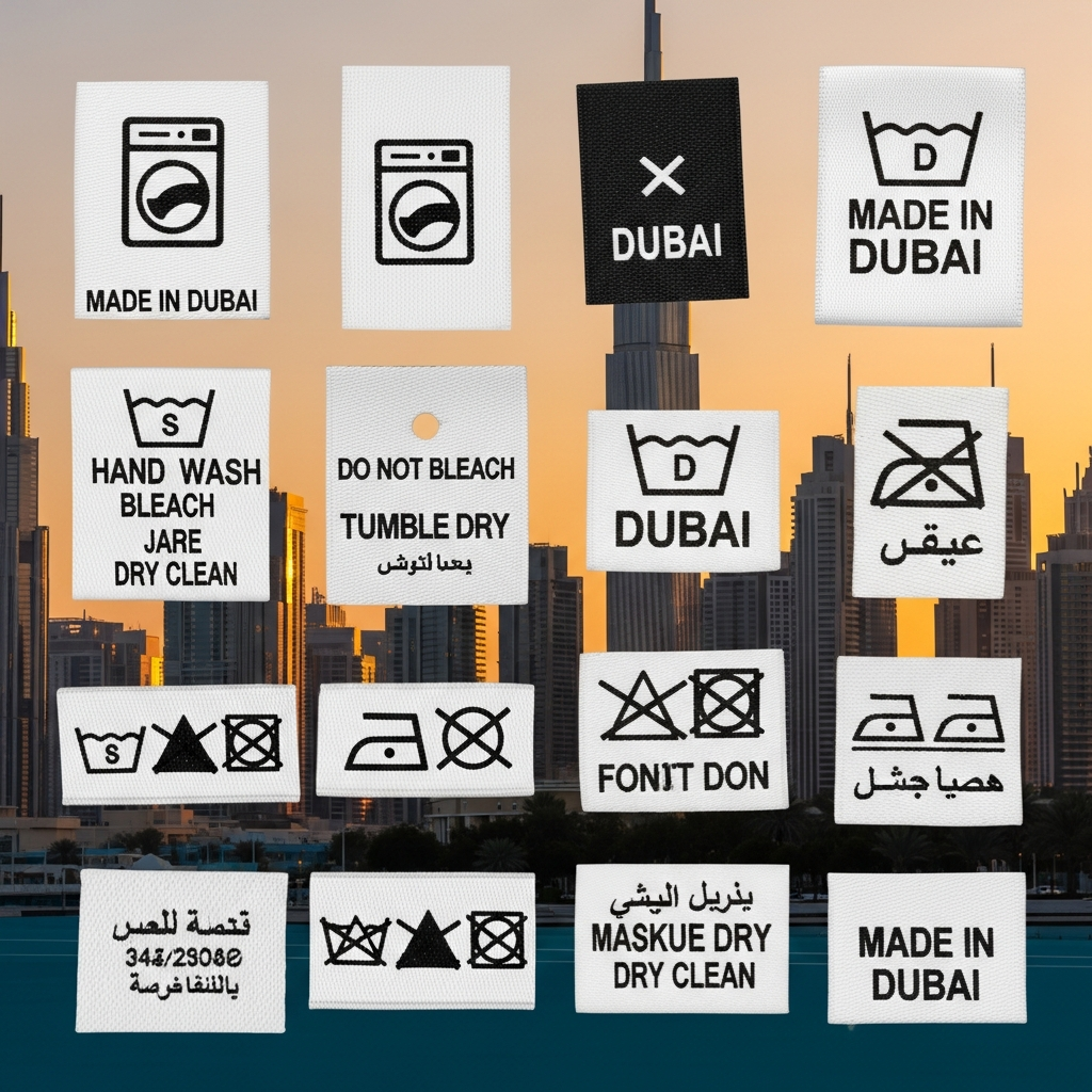 Wash care tags in Dubai printed or woven with clear symbols and text. Helps customers maintain garment quality over time.