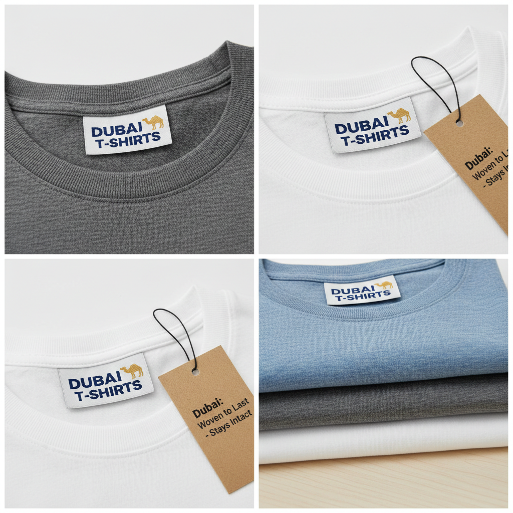 Custom woven labels for t-shirts in Dubai that add a professional and branded touch. Designed to stay intact through regular washing and daily wear.